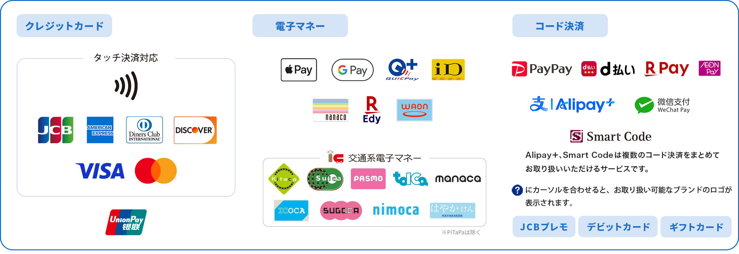 - Smart Codeは銀行Pay6種、GLN Payment8種を含む31種のコード決済をまとめてお取り扱いできます。(2025年8月末時点)